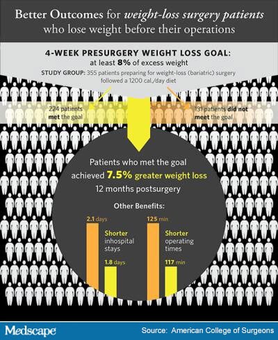 Patients who lose at least 8% of their excess body weight 4 weeks before undergoing bariatric surgery achieve greater weight loss over the next 12 months than those who do not lose this amount of weight preoperatively. Hence, presurgery weight loss should be encouraged for maximal success, new research indicates.